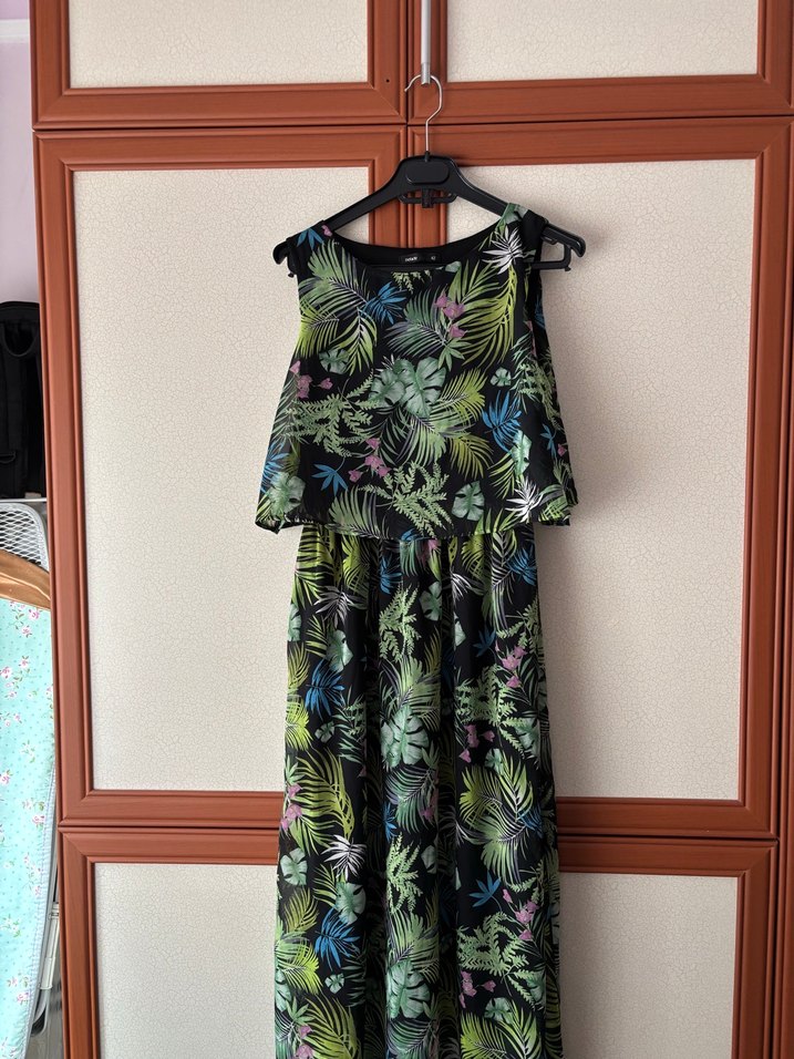 Kolsuz, straplez uzun elbise, bol kesim ve drapeli detaylarla çok renkli batik desenlidir, günlük kullanım için uygundur.