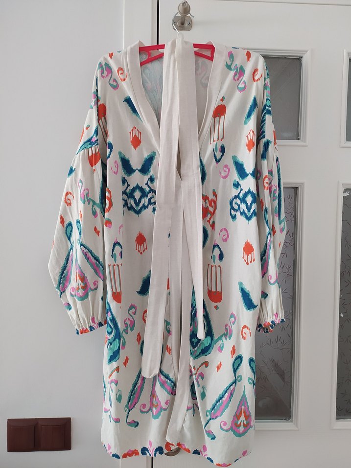 Hafif renkli, uzun boy, bol kesim kadın kimono. V yaka ve uzun kollu, canlı baskılı desenli, bohem tarz için uygun.