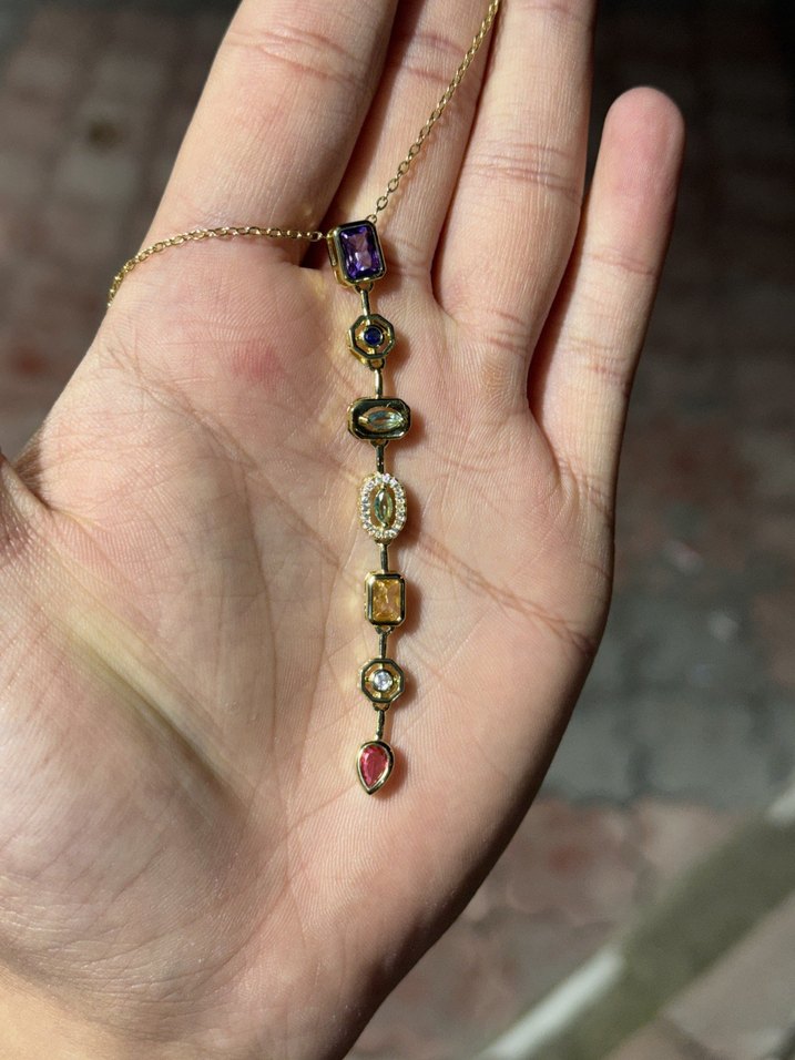 Bohem tarzda, çok renkli taşlara sahip zincir detaylı kadın kolyesi. Midi uzunlukta, günlük kullanıma uygun.