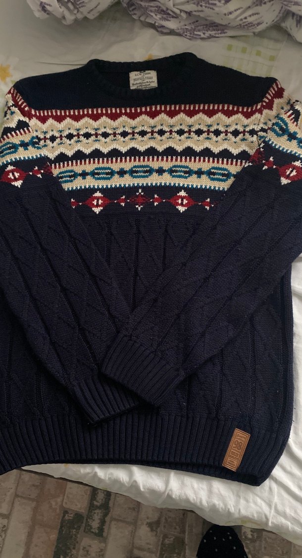 Bohem tarz desenli, uzun kollu ve yuvarlak yakalı erkek triko kazak. Rahat kesimi ve koyu renk çok renkli örgü yapısıyla günlük kullanıma uygundur.