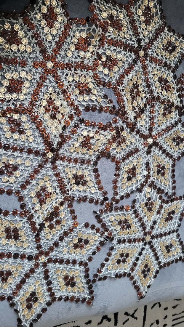 Kahverengi ve gri tonlarda, el işi bohem nakışlı geometrik desenler. Detaylı boncuk işçiliği ile zengin dokulu.