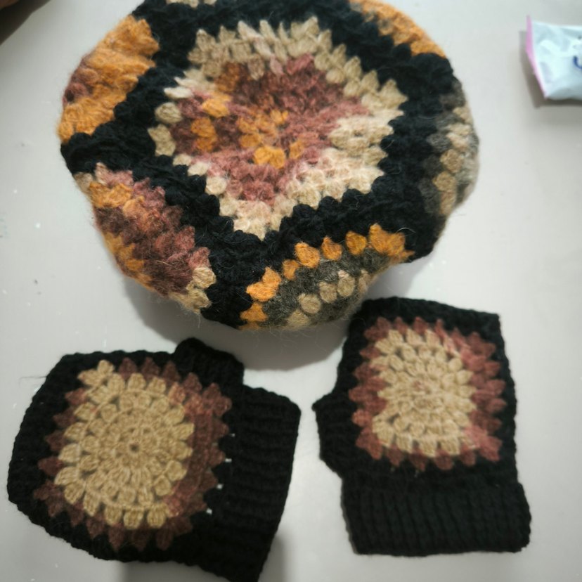 Bohem tarzda, sıcak toprak tonlarında, yumuşak iplikten el örgüsü bere ve parmakları açık eldiven seti.