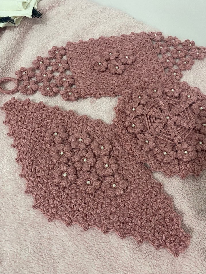 İnce işçilikle hazırlanmış, incili çiçek desenleri içeren bohem tarz el yapımı örgü seti lif sıfırdır hiçbir sorunu yoktur