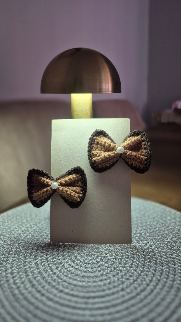 Hafif kahverengi örgüden yapılmış, küçük inci detaylı bohem tarz erkek küpeleri, sıcak ve nostaljik bir görünüm sunar.