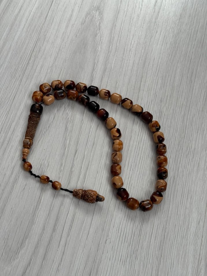 Bohem tarzı erkek kahverengi tesbih, koyu tonlarda ve işlemeli detaylarla. Pürüzsüz ve parlak boncuklar sağlam ipte sıralanmıştır.