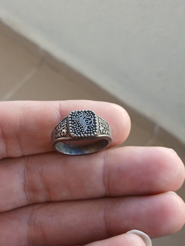 Detaylı işlemeli ve gri tonlu bohem tarzda vintage erkek yüzüğü. Klasik ve eski görünüme sahip.