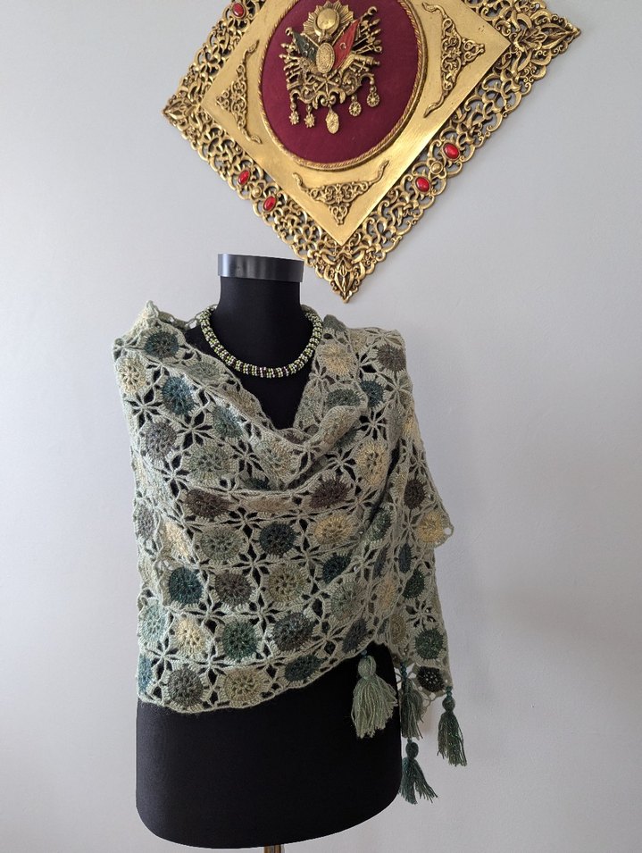 Gri ve haki renklerde, püskül detaylı, bohem ve retro tarzda drapeli örgü kadın şalı. Sakın renklerine uygun kolye