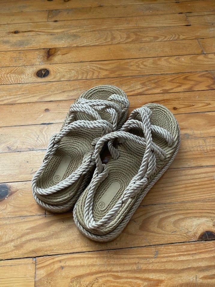 Bohem tarzda, hasır örgülü tasarımlı ve rahat kauçuk tabanlı gri platform sandaletler.