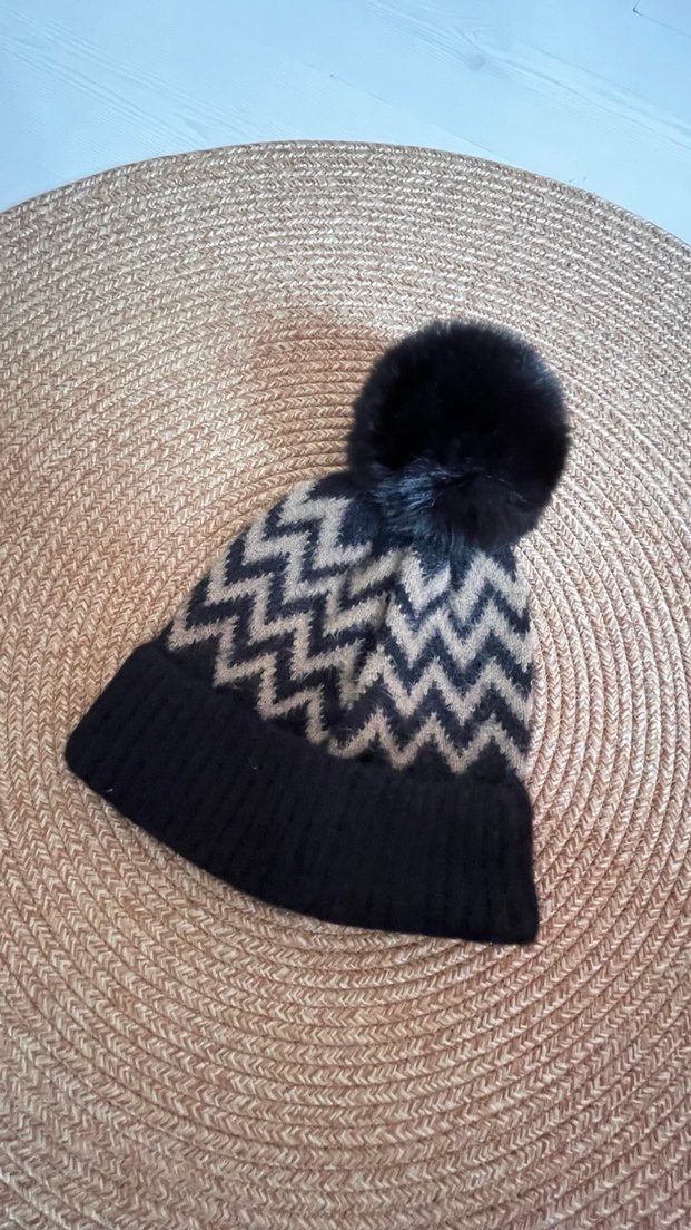 Gri ve kahverengi zigzag desenli, yumuşak ponponlu örgü bere. Rahat dokusu bohem ve retro tarzlara uygundur.
