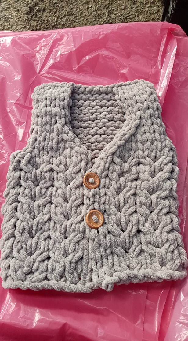 Fitted kesim, bohem tarzda, boğazlı ve kolsuz kız çocuk yeleği. Yumuşak örgü kumaştan, iki ahşap düğmeli, gri renkte.