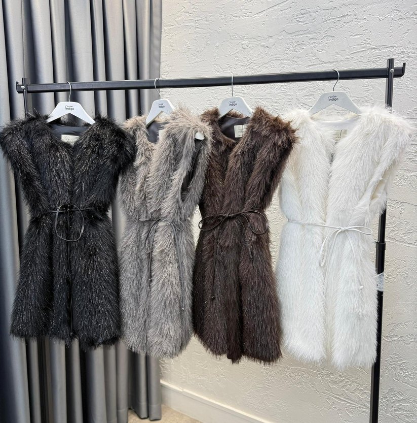 Kolsuz, gri renkli, bohem tarzda, midi uzunlukta ve straplez yakalı sentetik kumaş kürk yelek. Kürk detaylı, vücuda oturan kesim.