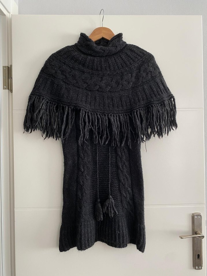 Gri örgü , yüksek yaka ve kolsuz tasarıma sahiptir. Bohem tarzda, desenli örgü ve püskül detayları bulunur. panço görünümlü triko mini elbise S/M uyumlu
