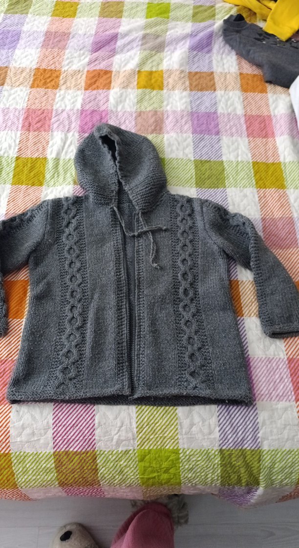 Bohem tarz gri renkli, kapüşonlu ve uzun kollu örgü hırka. Ön ve kol kısmında dekoratif örgü desenleri bulunuyor, fermuarlı
