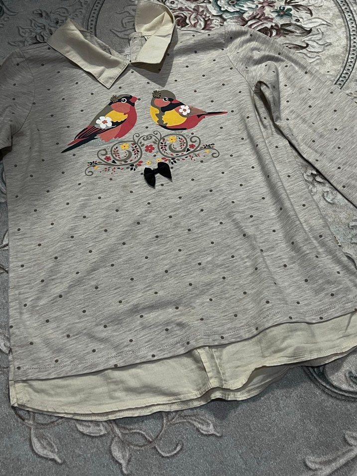 Uzun kollu, yakalı ve bol kesim kız gömleği. Yumuşak dokulu kumaştan, düğmeli ve kuşlu baskılı bohem tarzda. Gri renkte, küçük puantiyelerle.