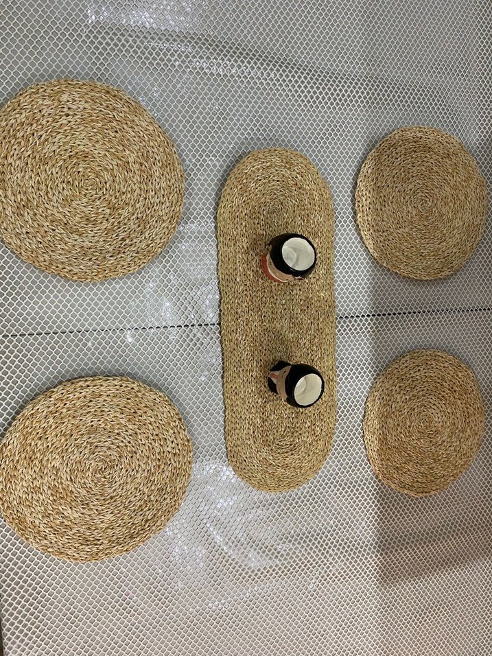 Bej renkli hasır amerikan servisler ve uzun dekoratif parça ile bohem tarzda doğal ve sıcak bir masa düzeni sağlar. ️