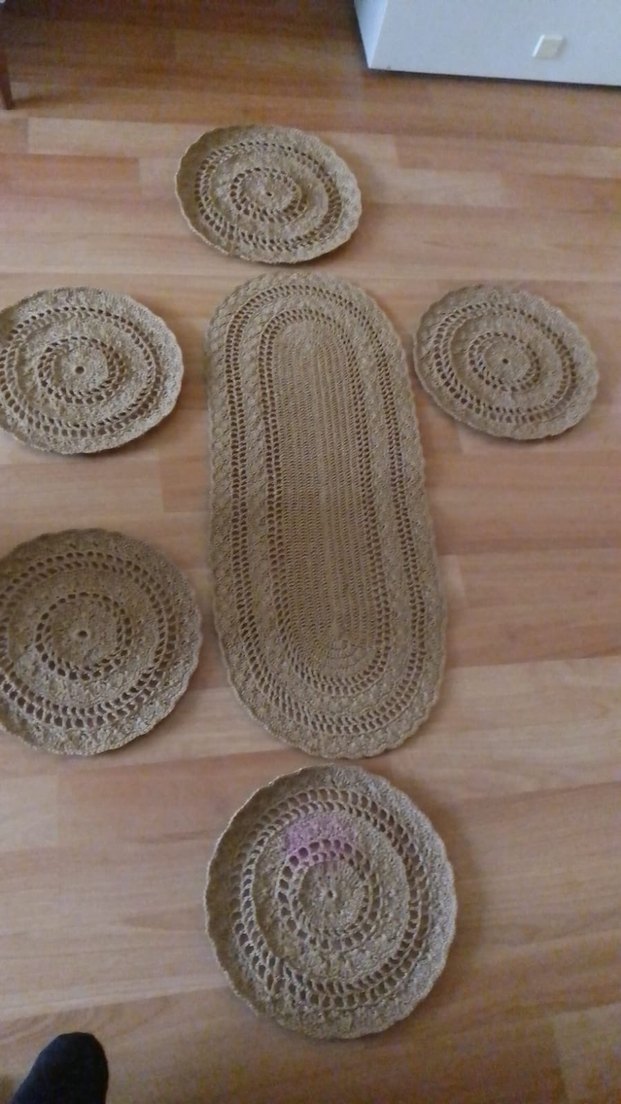 Bohem tarzda, doğal liflerden yapılmış uzun oval örgü masa örtüsü ve altı yuvarlak örgü bardak altlığı seti. Masanıza rustik bir dokunuş katar. El emeği kendim yaptım öğrenci olduğum için bu ücret anlayışınız için teşekkür ederim