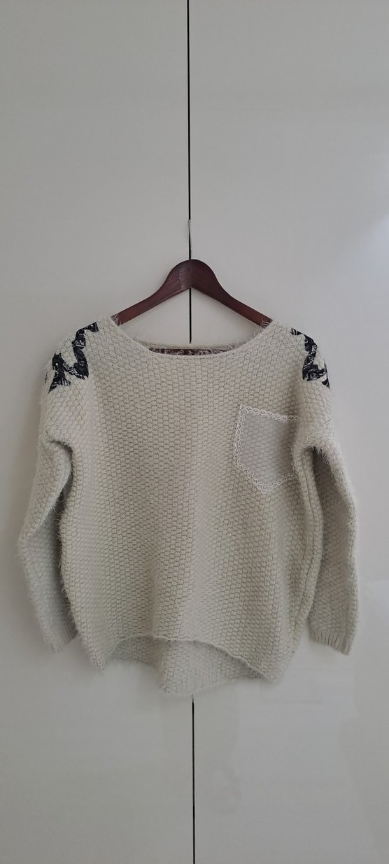 Örgü kumaştan, bol kesim, bisiklet yaka ve uzun kollu bohem tarzda gri tonlarında kadın kazak. Rahat ve günlük kullanıma uygun.