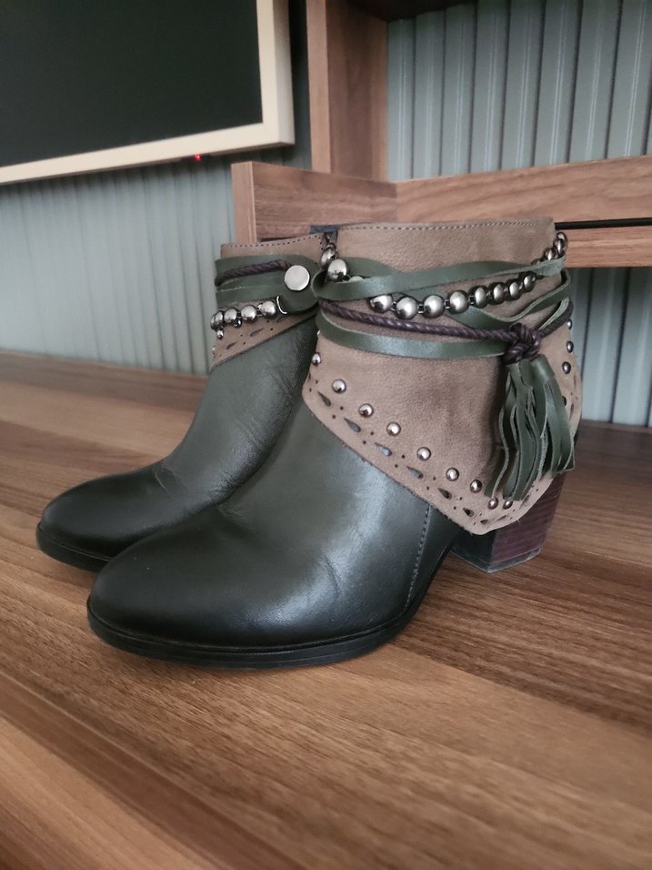 Bohem tarzı kadın deri botlar, tokalı kayışlar ve işleme detaylarıyla gri ve haki tonlarında, günlük kullanım için uygun.