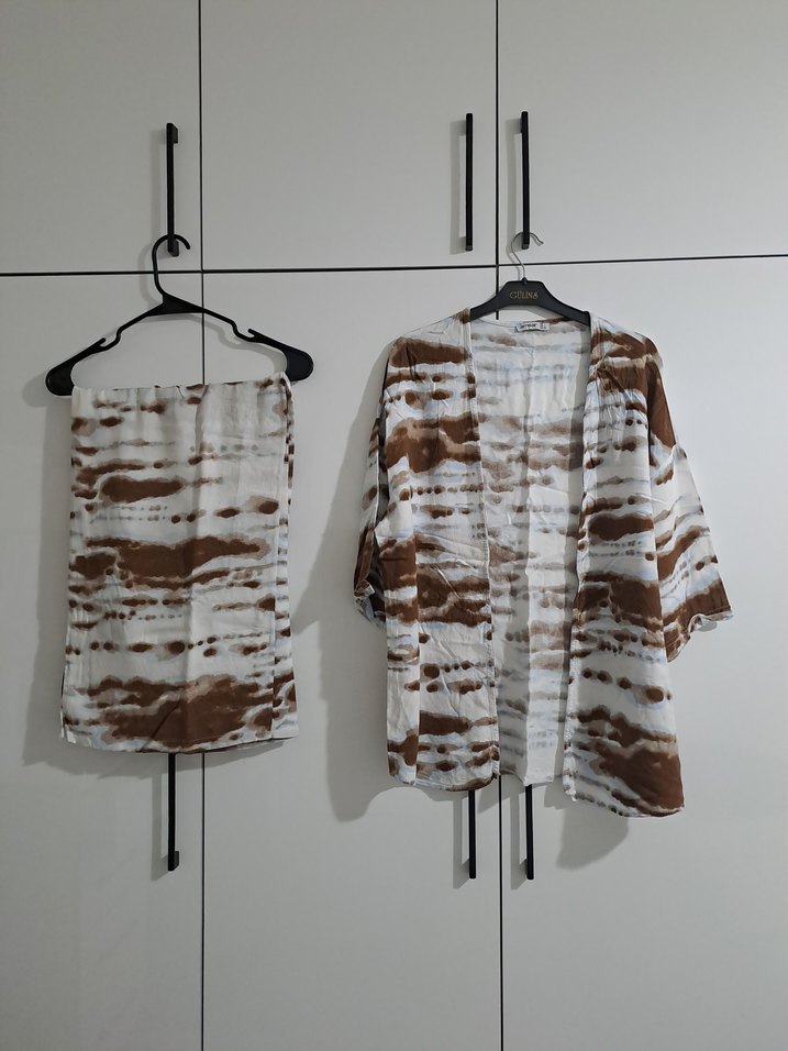 Kahverengi keten kumaştan, midi boy ve bol kesim bohem tarz kadın kimono takımı.