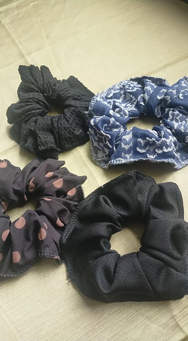 Bohem ve grunge punk tarzlarına uygun, koyu ve mavi tonlarda dört adet lastikli tekstil saç tokası seti.
