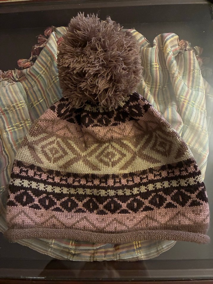 Büyük ponponlu, koyu kahverengi örgü bere. Geometrik desenlerle bohem, retro ve hippie tarzına uygun rahat bir model.
