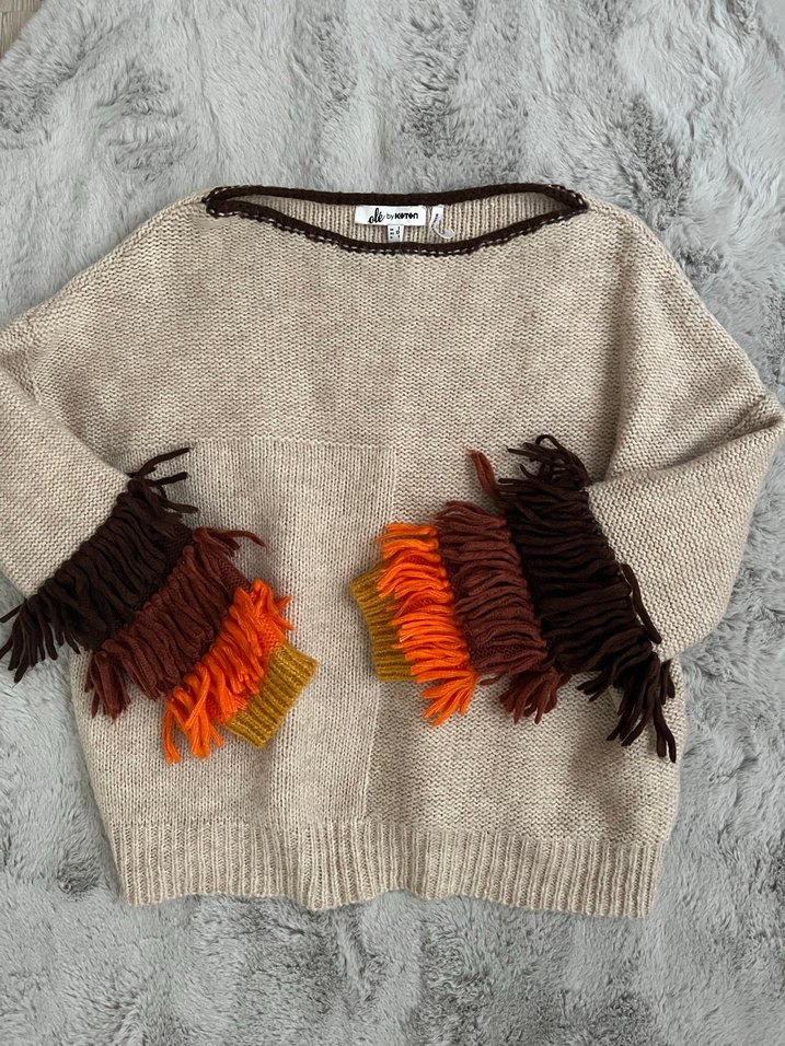 Kadınlar için bol kesim, uzun kollu, yuvarlak yaka örgü kahverengi kazak. Kollarında renkli püskül nakışlarıyla bohem ve retro tarzı yansıtıyor. Günlük kullanım için uygun.