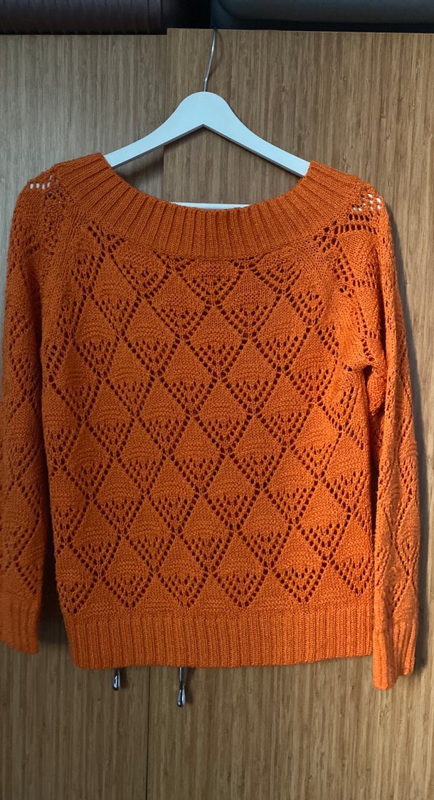 Turuncu örgü, uzun kollu, salaş kesim ve kayık yaka kadın kazak. Rahat ve bohem tarzda, günlük kullanıma uygun.