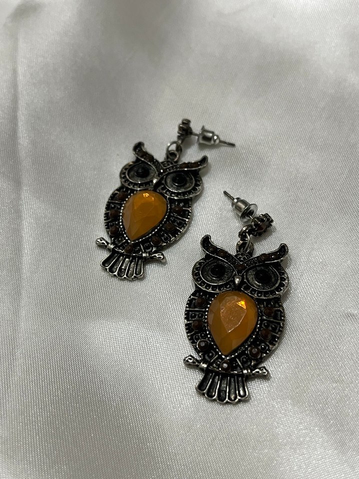 Bohem tarzda, desenli baykuş figürlü ve koyu kahverengi boncuklu küpeler. Midi uzunlukta, romantik randevular için vintage havası taşıyor.