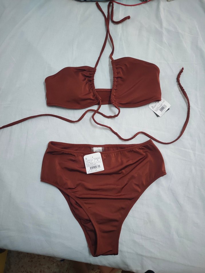 Bu kahverengi bikini, ince askılarla ve minimalist bohem tarzıyla plajda şıklık sunar. Kısa ve vücuda oturan kesimiyle dikkat çeker.