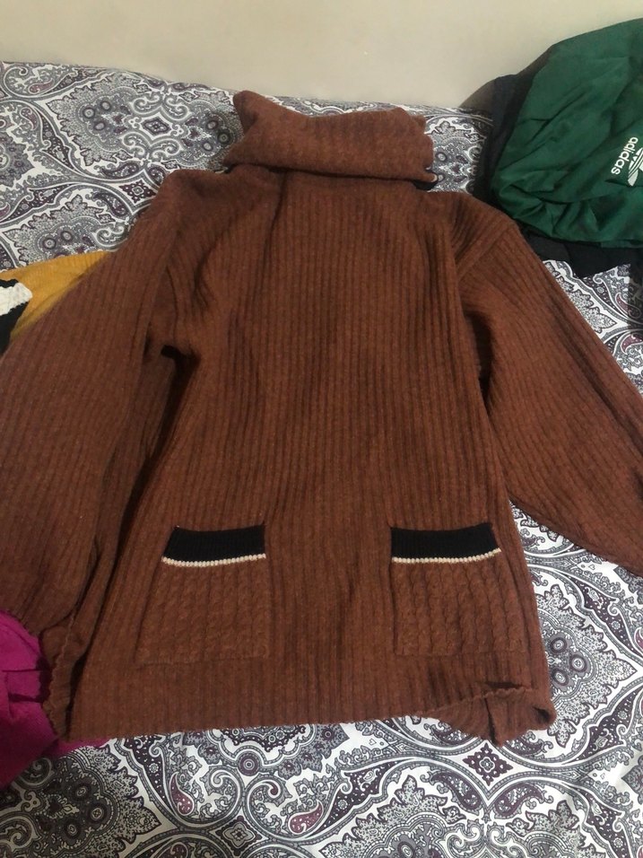 Kahverengi, boğazlı, uzun kollu ve bol kesim örgü kazak. İki küçük cep ve midi uzunluğunda, bohem stil için uygun.