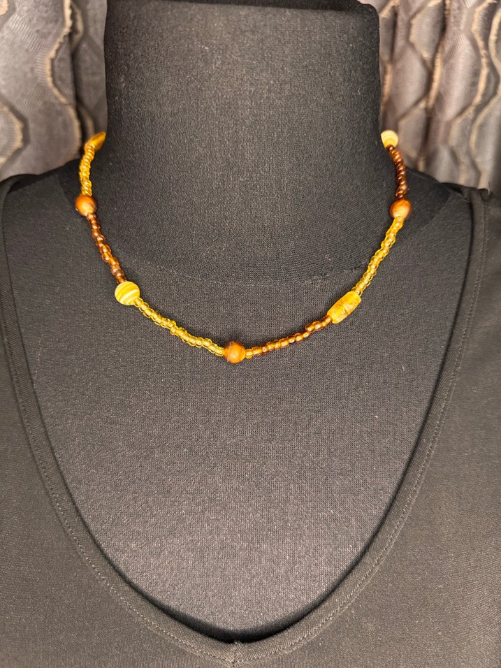 Bohem tarzda, kahverengi boncuklardan oluşan midi uzunlukta, desen içermeyen sade bir kolye. Günlük kullanıma uygundur.