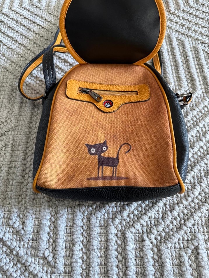 Koyu kahverengi deri sırt çantası, tokalı ve baskılı kedi desenli, bohem ve retro tarzda. Günlük kullanım için uygun, rahat ve hippie havasında.