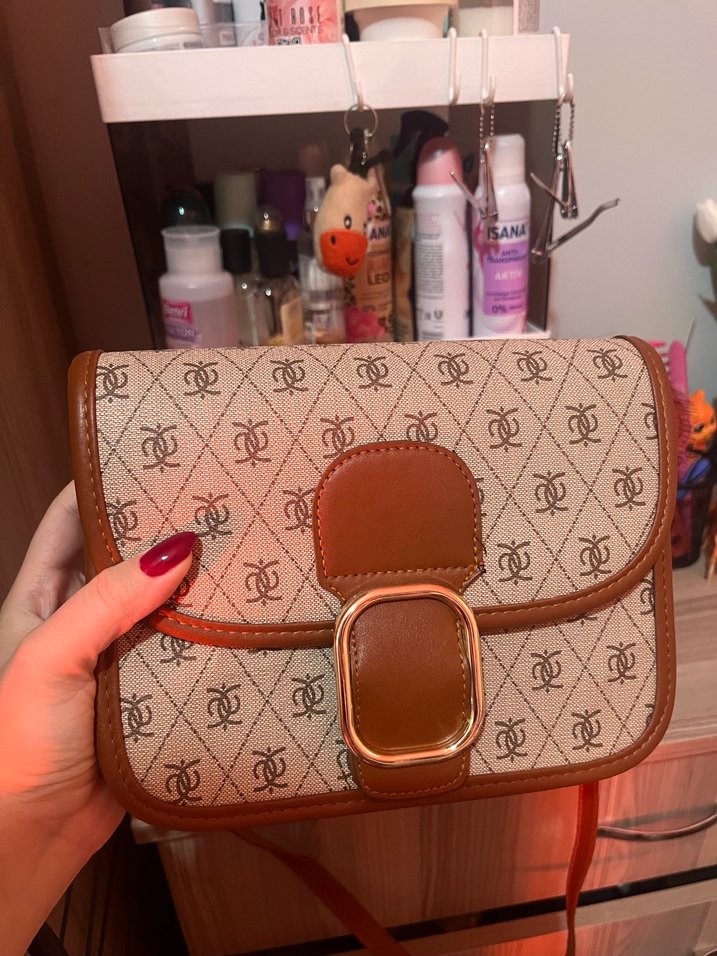 Bohem tarzda, tokalı kapaklı, hafif kahverengi baskılı deri çanta. Günlük kullanıma uygun.