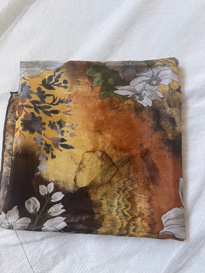 Bohem tarzda, kahverengi çiçek desenli, yumuşak sentetik kumaştan yapılmış ve drapeli kadın fuları. Tane fiyatı 100 tl