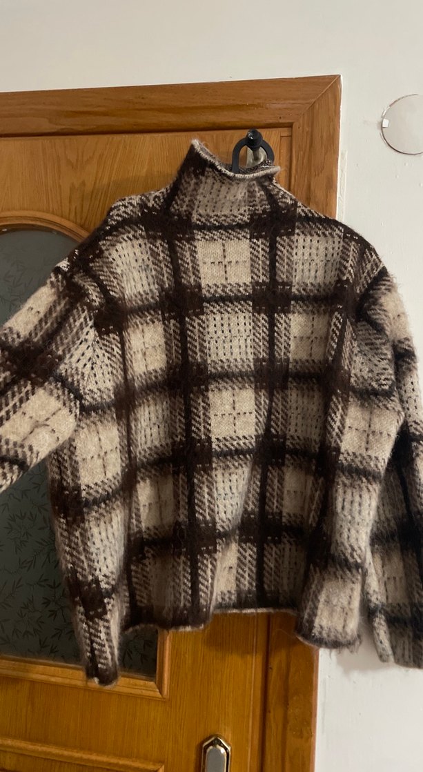 Kahverengi ekoseli, yün örme kumaştan yapılmış, balıkçı yaka ve uzun kollu bol kesim kazak. Günlük sokak stili için ideal, bohem ve retro havası taşır.