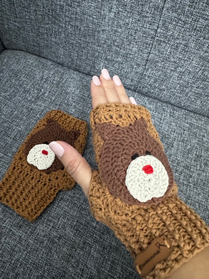 Bohem tarzda, kahverengi örgü kadın eldivenler, sevimli ayı deseniyle rahatlık ve sıcaklık sağlar. Parmakları açık modeldir. Standart beden Tüylenme yapmaz
