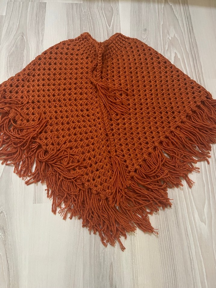Kiremit renk örgü kız çocuk panço, bol kesim, kayık yaka ve askılı kollu. Uçlarında püskül detaylarıyla bohem tarzda.