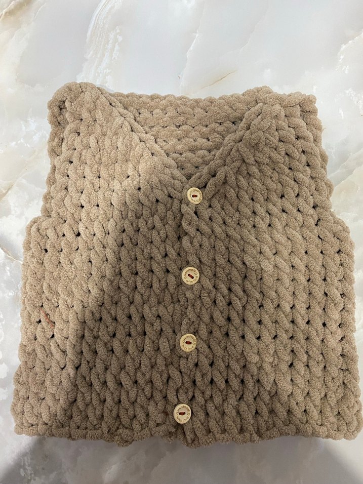 Kahverengi, yumuşak örgüden yapılmış, V yaka ve salaş kesime sahip bebek süveter. Kolsuz ve bohem tarzıyla günlük kullanıma uygundur. İstenilen modelde ve renkte yapılır
