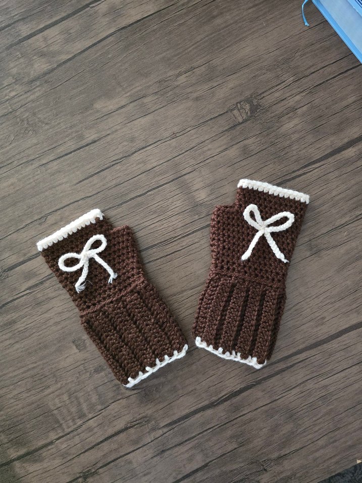 Kahverengi, örgü yapıda, beyaz fiyonk detaylı bohem tarz eldivenler. Sıcak tutan ve rahat kullanımlı tasarım.