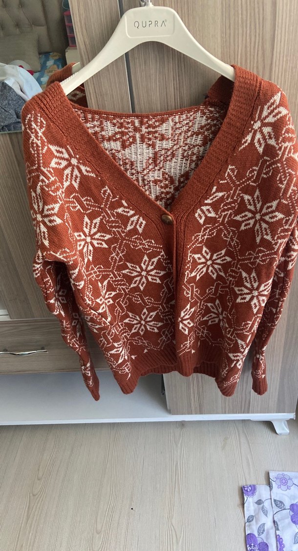 Bu kahverengi örgü hırka, bohem tarz desenleri, V yaka ve bol kesimiyle günlük kullanıma uygun rahat ve retro bir görünüm sunar.