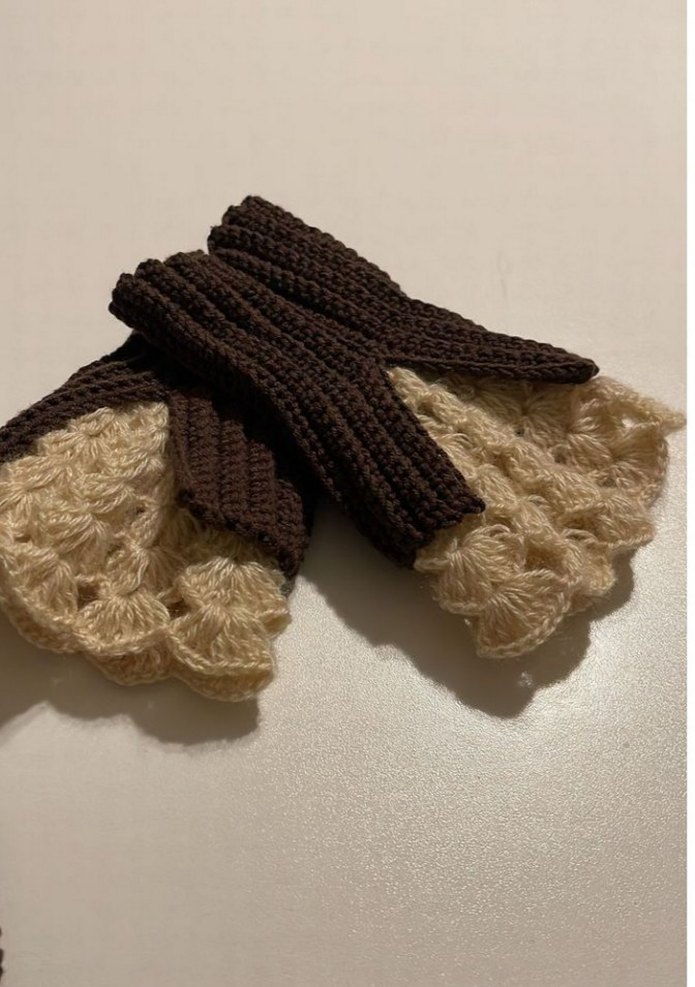 Koyu kahverengi örgü kadın eldivenler, krem renkli tığ işi manşetlerle bohem tarzda, nostaljik bir görünüm sunar.