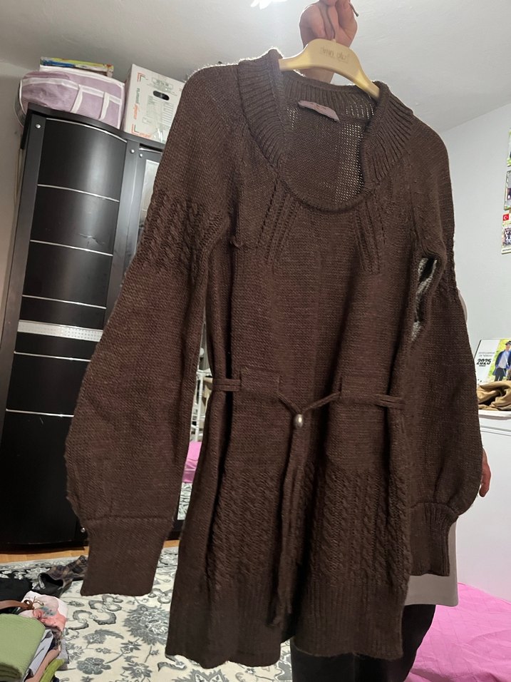Kahverengi örgü, bohem tarzda, yüksek yakalı, uzun kollu, midi uzunlukta, bol kesim kadın kazak. Rahat ve günlük kullanım için uygundur.