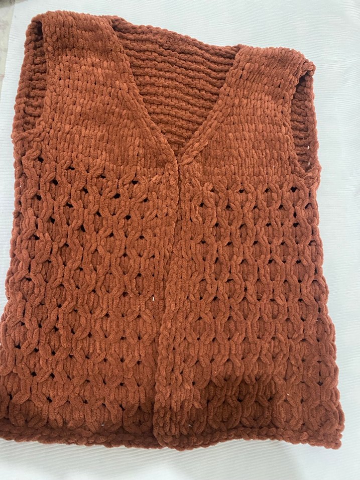 Koyu kahverengi, örgü kadın yelek. Kolsuz ve V yaka, bol kesim, bohem tarzıyla günlük kullanım için uygundur.