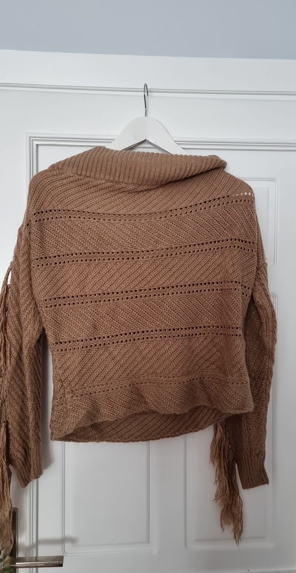 Bu kahverengi örgü kadın kazağı, bol kesim, sıcak tutar, arkasında ve kollarında püsküller var, beden small
