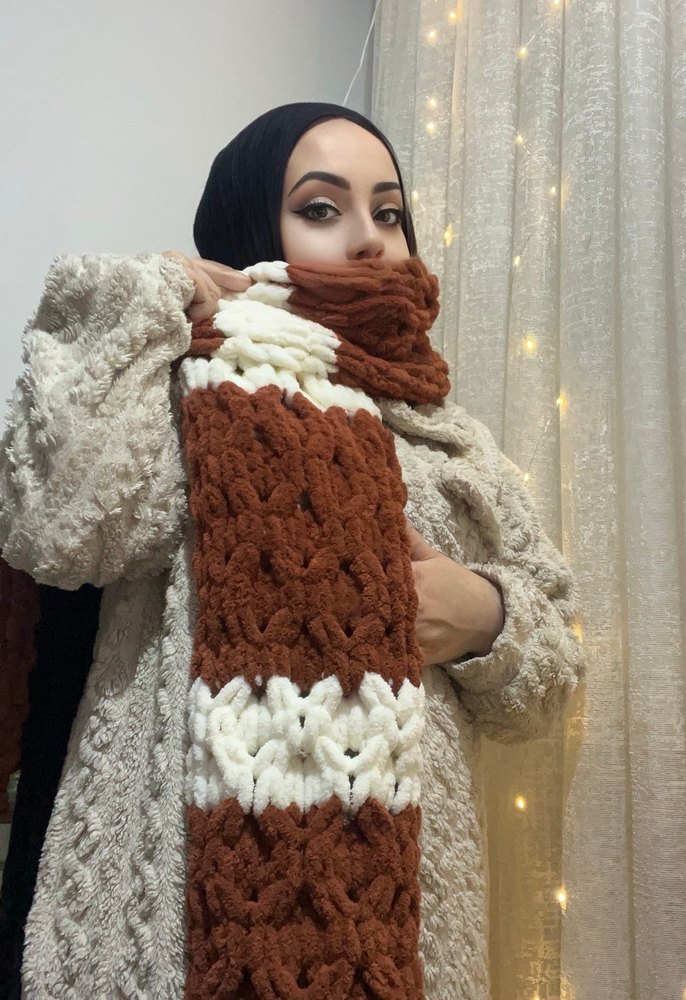 Kahverengi örgü şal, kalın örme dokusuyla bohem tarzda sıcaklık ve retro bir hava katar.