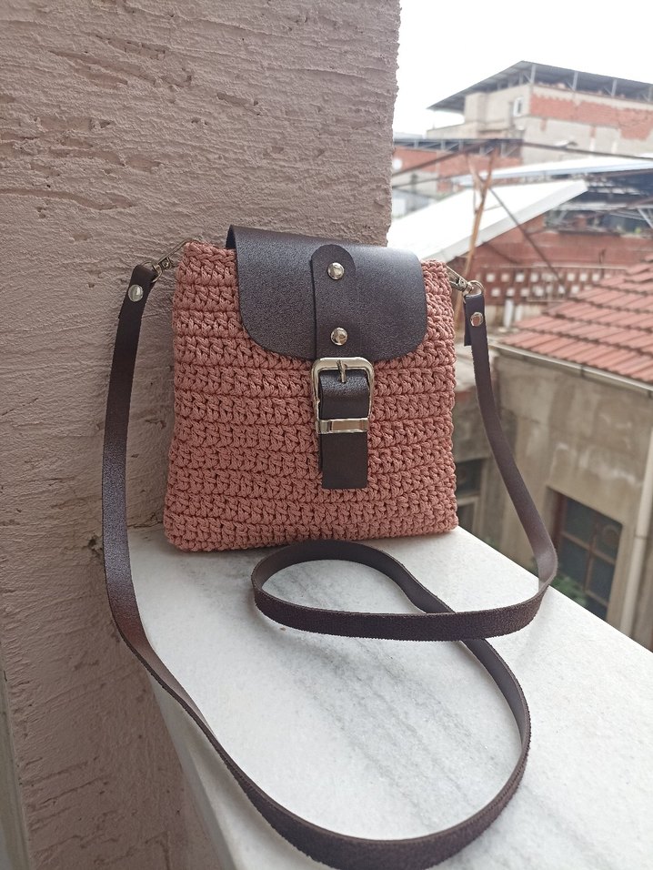 Bohem Tarz Kahverengi PembeÖrgü Kadın Çapraz Çanta