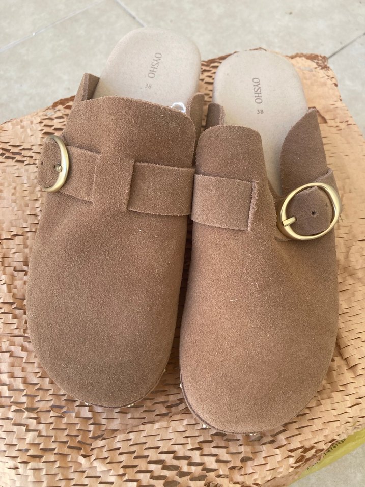 Kahverengi süet kadın terlik, kama topuk ve tokalı detay ile rahat bohem tarzda günlük kullanım için uygundur.