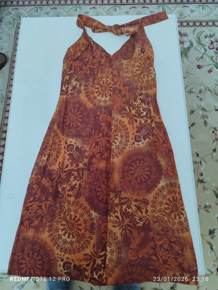 Kahverengi tie-dye desenli, askısız, uzun elbise. Rahat kesim ve drapeli tasarıma sahip, yumuşak sentetik kumaştan yapılmıştır. Bohem tarz için uygun.