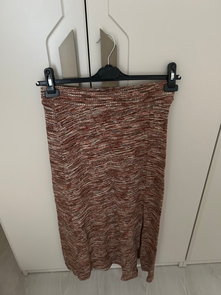 Bohem tarzında, örgü dokulu, kahverengi batik desenli, uzun ve vücuda oturan sentetik kumaştan yapılmış etek. Günlük kullanım için uygundur.