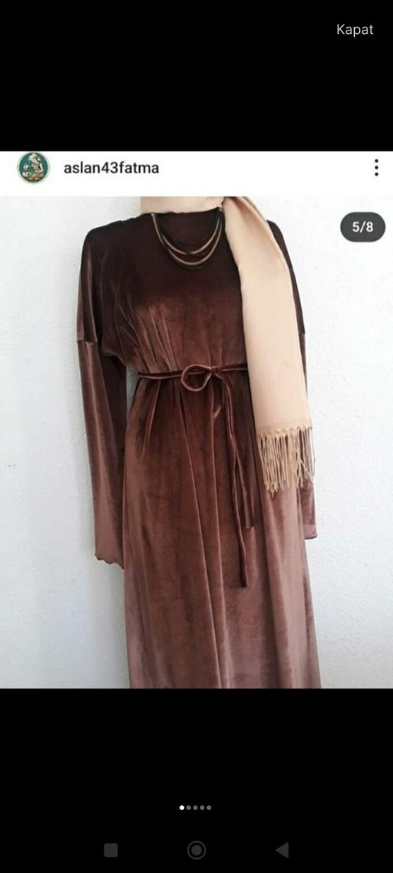 Kahverengi uzun süet elbise, bol kesim, drapeli detaylar, yüksek yaka ve askılı kollara sahip. Bohem retro tarzını yansıtır. Günlük kullanım için uygun. uygulamadan aldim çok kısa geldi satıyorum kumaşı ince kadife